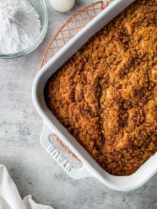 Bake your coffee cake in a 350 degree oven for 50-55 minutes or until a toothpick comes out of the center of the cake clean. Once it is done baking, transfer the baking dish onto a cooling rack or a wooden cutting board to cool for about 10 minutes.