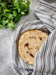 - Transfer cooked tortillas onto a plate wrapped with a clean kitchen towel to keep them warm as you cook the other tortillas