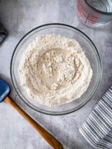 Start by adding 1 cup of very warm water and mix with a silicone spatula or stiff wooden spoon until it is fully combined. Add additional very warm water, a few tablespoons at a time, until you develop a soft, kneadable dough that will hold together easily when squeezed in your palm, but is not sticky.