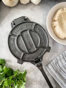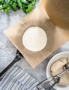 So, you have a few options. If you have a tortilla press, this is the easiest way. Simply fold a sheet of parchment paper in half or line both halves with plastic wrap and let the press do the rest of the work! If you are trying to decide on a tortilla press, I highly recommend Victoria Cookware’s cast iron tortilla press. Its heavy duty and I have loved mine for a long time now!