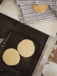 Once your griddle is very warm and your first tortilla has been shaped, place the tortilla on the dry, preheated skillet and cook it for about 60 seconds on the first side. Flip the skillet over and cook it on the other side for 30-60 seconds or until you have some nice char marks on that side.