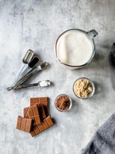 Begin by gathering 2 1/2 cups of unsweetened almond milk (I use unsweetened vanilla, but plain works too), 2 tablespoons of sugar (brown, granulated, raw, coconut or palm), 1/2 teaspoon of cornstarch, 1 tablespoon of cocoa powder, 1 teaspoon of vanilla extract and 4 ounces of chocolate (milk, dark or vegan).