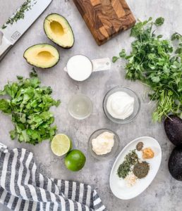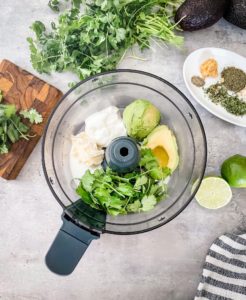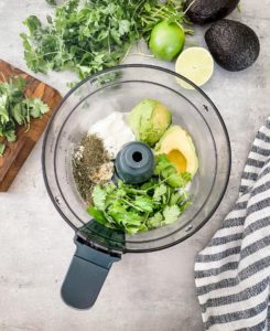 Begin by gathering the flesh of 1 medium ripe avocado, 1/4 cup of plain Greek yogurt (or sour cream), 2 tablespoons of mayonnaise (or simply add 2 additional tablespoons of Greek yogurt to reduce the calories in this dressing), 1/4 cup of buttermilk (or your favorite milk), 1/3 cup of fresh cilantro (or dill, parsley or chives), 1 tablespoon of fresh lime juice (or lemon or even orange juice), 1 teaspoon of pasted garlic, 1 teaspoon of dried dill, 1/2 teaspoon of dried chives, 1/2 teaspoon of dried parsley, 1/2 teaspoon of onion flakes and a pinch of salt and black pepper.