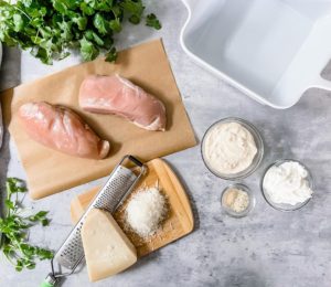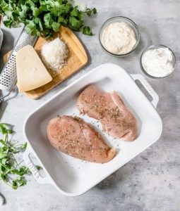 To begin, gather 2 boneless skinless chicken breasts, 1/2 teaspoon of garlic powder, 1/2 teaspoon of onion powder, 3/4 cup of creamy caesar dressing, 1/2 cup of sour cream, 3/4 cup of parmigiano reggiano and some finely chopped fresh parsley for garnishing.