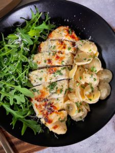 I could spend the next three or four paragraphs explaining how delicious this chicken is, but I think I will just tell you that you are going to love it and that I am quite certain that you are going to be making this creamy caesar baked chicken again and again and again…