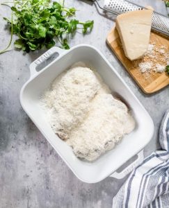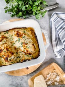 Seasoned chicken breasts are baked in a smooth, creamy caesar dressing loaded with parmigiano reggiano. This sauce transforms into something truly fabulous and once you pull those juicy chicken breasts out of the baking dish, there will be a little extra sauce in the dish that I highly recommend tossing some cooked pasta into. This meal is decadent, satisfying, incredibly flavorful and wonderfully comforting…. sounds great, right?