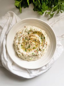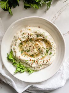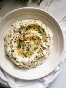 Once it is smooth and creamy, transfer it into a bowl, add a thin slice of butter on top and sprinkle with a little black pepper, red pepper flakes and parsley.