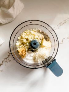 Add 1/3 cup of sour cream, 1/2 cup of finely shredded parmigiano reggiano or parmesan, 3 crushed cloves of garlic, 3 tablespoons of butter, 1/2 teaspoon of onion powder, 1/4 teaspoon of salt and a pinch of black pepper in with the cauliflower. Pulse until everything is fully incorporated and smooth.