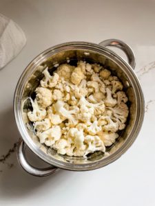 - Drain the water from the pot, but leave the cauliflower inside the pot