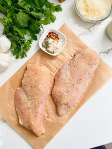 Start by seasoning 2 medium boneless skinless chicken breasts with garlic powder, onion powder and Italian seasoning. If you are working with particularly large chicken breasts, simple slice 1 in half length wise to create 2 thin cutlets. If you don’t have an Italian seasoning blend, you can use a pinch of thyme, rosemary, oregano and basil or your favorite dried herbs.