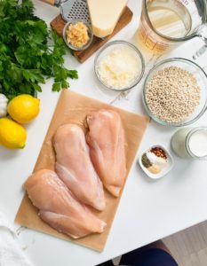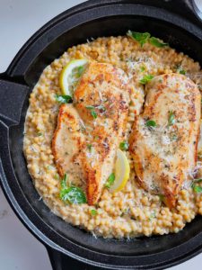 To make this fabulous creamy garlic lemon couscous with chicken for 2, you will need 2 boneless skinless chicken breasts and 1 cup of the Israeli couscous plus 1 1/2 cups of chicken stock, 1/2 cup of heavy cream, 1/2 cup of finely shredded parmesan, 4 minced cloves of garlic, 2 lemons, 1/2 teaspoon of garlic powder, 1/2 teaspoon of onion powder, 1/2 teaspoon of an Italian seasoning blend and 1/4 teaspoon of red pepper flakes (less if you prefer a more mild spice level).