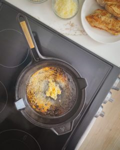 Once the chicken is cooked, transfer it onto a plate and add the juice from 2 lemons into the skillet. Stir the lemon juice around a bit to both cool the pan down a little and work up any brown bits left behind from the chicken.