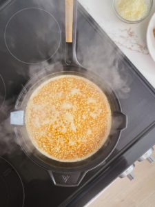 Now add the couscous into the skillet and let it toast in the pan for 2-3 minutes. While the couscous is toasting, keep moving it around the pan, so each little pearl has chance to get some color and heat.
