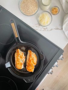 Cook for 2-3 minutes on the first side or until the bottom is golden brown. Flip the chicken and cook until it is cooked through with no pink and an internal temperature of 165 degrees.