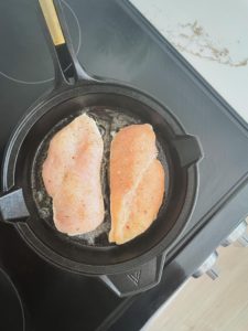 - Cook the chicken for 2-3 minutes on the first side and once it is golden brown, flip and cook until the chicken is cooked through with no pink and an internal temperature of 165 degrees
