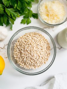 There are three main types of couscous: Moroccan couscous, which is teeny tiny and cooks in just a few minutes, Lebanese couscous, which is the largest version and is best cooked for a long time over low heat and then Israeli couscous, which is what we are using today.