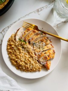 If you are unfamiliar with couscous, it is great. Easy to cook, soaks up flavors really well and contains some good health benefits too. Couscous contains the powerful antioxidant selenium, which helps to decrease inflammation, plaque and cholesterol on our arteries and can also give our immune system a boost. This mediterranean staple is something we should all keep in our pantry, because this creamy garlic lemon couscous with chicken is just one of many delicious ways to enjoy this beautiful little pasta.