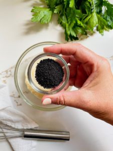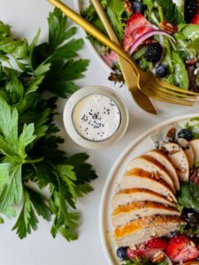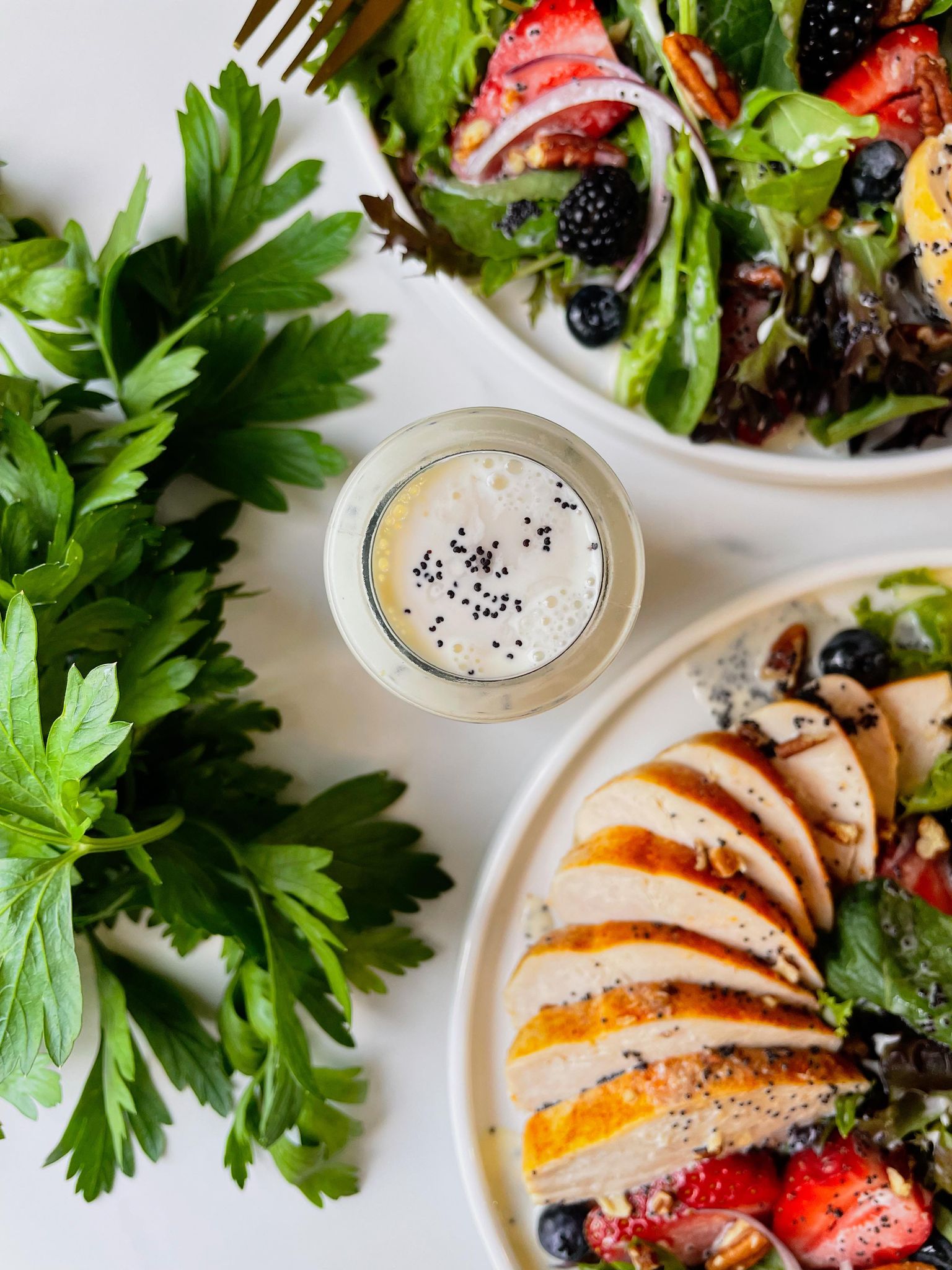 When it comes to the spice options, I prefer the flavor that celery salt brings to this dressing, but dry mustard is a classic pairing with poppyseed dressings and turmeric will bring a warmth that fits nicely with this dressings creamy texture. I recommend making the dressing up without the spice, giving it a taste and then adding what you think you will enjoy most… or nothing at all, because it is delicious as is too!