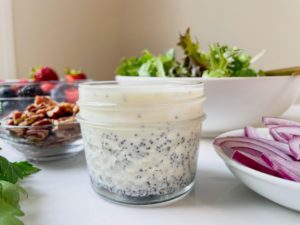 This creamy poppyseed dressing is just delicious and does a great job of hitting all of the important dressing flavor notes. It gives you the creaminess you want from a dressing with no oil needed and it checks off the salty, tangy, sweet and nutty flavors that a great salad should be dressed with.