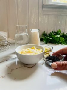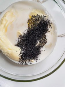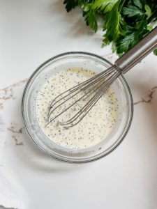 Begin by gathering 1/2 cup of plain greek yogurt (full fat greek yogurt will give you the best flavor and creaminess, but lower fat greek yogurt will also work fine) or a good quality mayonnaise along with 2 tablespoons of milk, 2 tablespoons of honey, 1 tablespoon of white vinegar, 2 teaspoons of poppyseeds (I love Spice Islands Poppyseeds!) and an optional pinch of celery salt, dry mustard or turmeric.