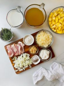 In addition to the potatoes, you will need 4 strips of bacon (or 4 ounces of pancetta), 1 large diced yellow onion, 4 cloves of finely minced garlic, 1/4 cup of all purpose flour, 32 ounces of chicken stock, 2 cups of milk, 1/2 cup of sour cream or plain Greek yogurt, 1 1/2 cups of shredded sharp white cheddar, 1-2 teaspoons of onion powder and some salt and black pepper.