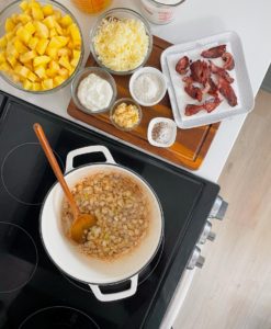 - Place a large pot over medium heat and add 4 strips of bacon cut in half or thirds