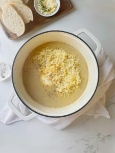 Add 32 ounces of chicken stock and 2 cups of whole milk and bring the mixture up to a simmer.