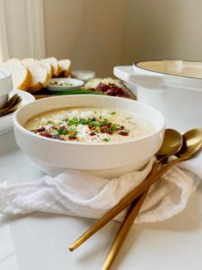 Potato soup is one of those things that sounds super cozy and comforting, but is often disappointingly bland. Potatoes are great, but they need to be seasoned generously in order to shine and being surrounded by delicious dance partners helps too.