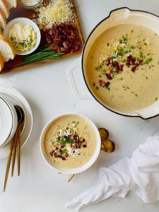 This creamy potato soup is lovely. It is thick and creamy with little chunks of tender potatoes speckled throughout each bowl. The sour cream and melted cheddar add to the texture too. It is just luscious and wonderful.