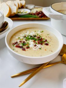 This soup definitely has great flavors too. You really get that comforting mashed potato taste with saltiness from the bacon, a nice little hit of garlic, tang from the sour cream and sharp cheddar cheese. The layers are delicious and all lift up the beautiful potato.