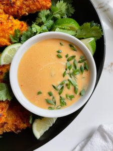 This creamy version of my sweet Thai chili sauce is delicious. It is salty, sweet and full of umami. I love it as a dip for coconut chicken or shrimp, served along side a crispy fish filet or drizzled over noodles. This creamy sauce is a versatile pairing for so many asian inspired comfort foods and you’re going to love it!