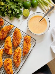 Simple combine 2/3 cup of good quality mayo (I love Duke’s!) with 1/4 cup of sweet thai chili sauce, 1 clove of grated garlic, 2 tablespoons of soy sauce and 1 tablespoon of lime juice in a small bowl. Whisk until everything is fully combined and then do a quick taste test to see if you need another splash of soy or lime juice.