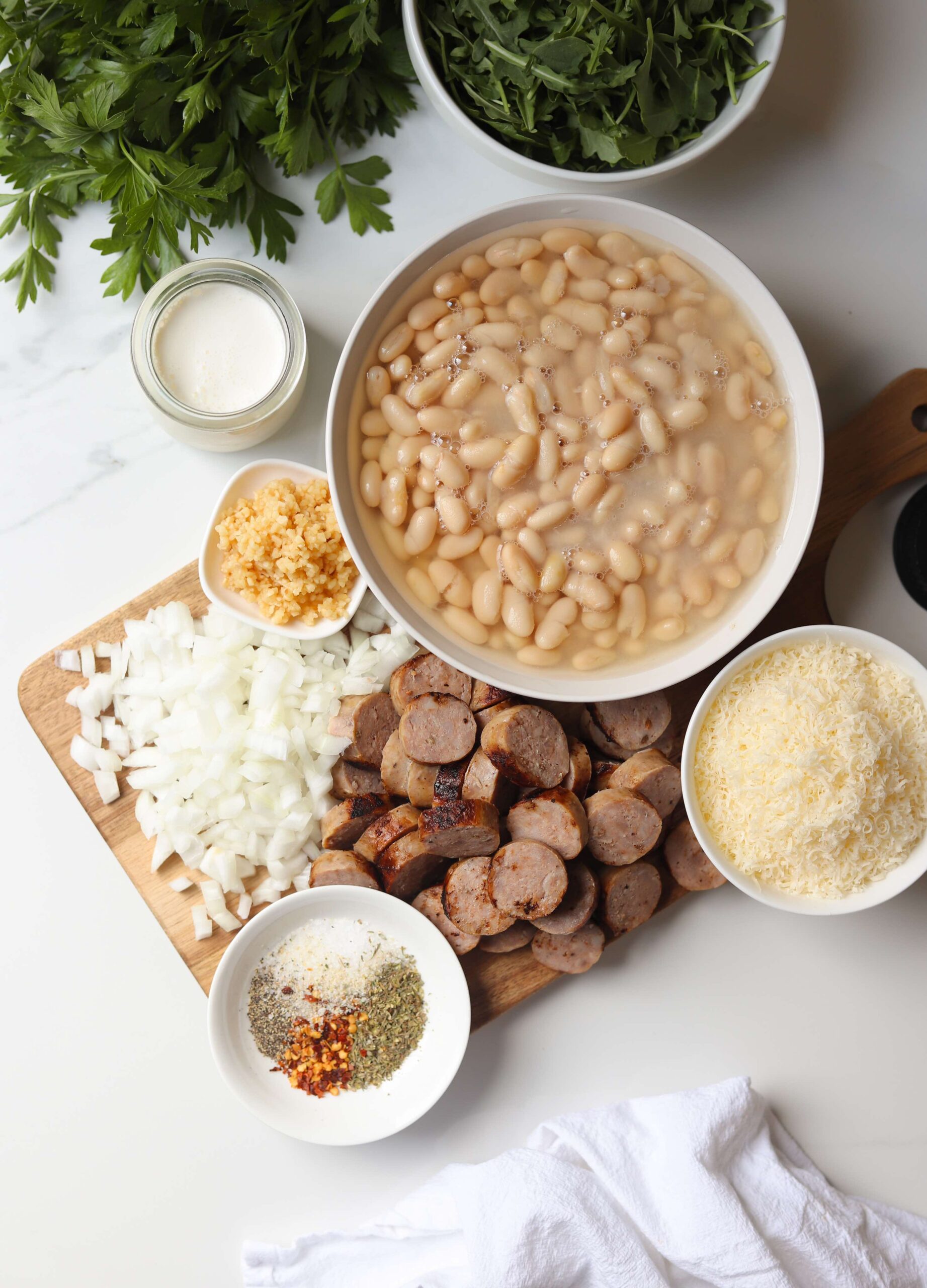 To make a skillet that will serve four generously, you will need a large yellow onion, 4 cloves of garlic, 31 ounces of cannellini beans, 1/2 cup of heavy cream, dried Italian herbs, red pepper flakes, some kale, arugula or spinach, a cup (or more) of parmesan and 19 ounces of Italian sausage links. You can use sweet or hot Italian sausage and smoked or uncooked sausage. If you are using raw sausage, cook the links whole and then allow them to cool before slicing them.