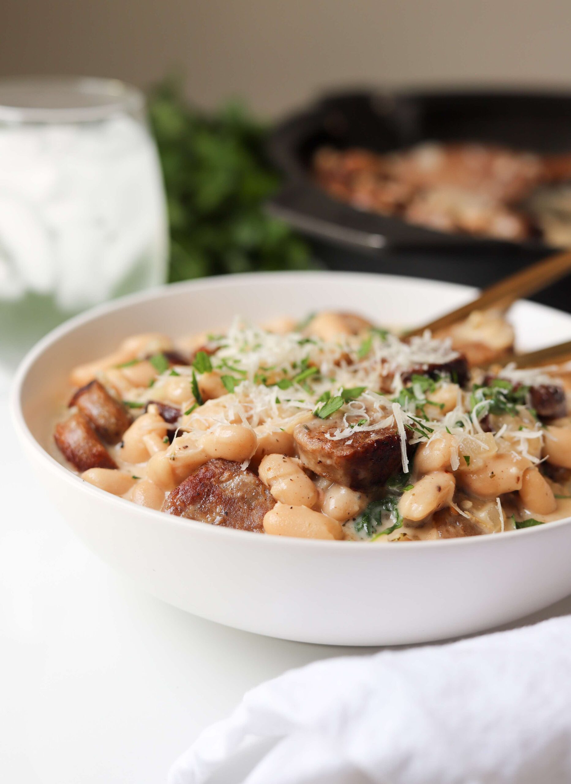 Fall has officially arrived and with it comes the need… no, requirement for hearty, comforting meals. These creamy tuscan white beans with sausage are fantastic. Everything comes together in the same skillet and if you use smoked sausage (or any cooked sausage), the whole thing will be ready in less than 20 minutes.