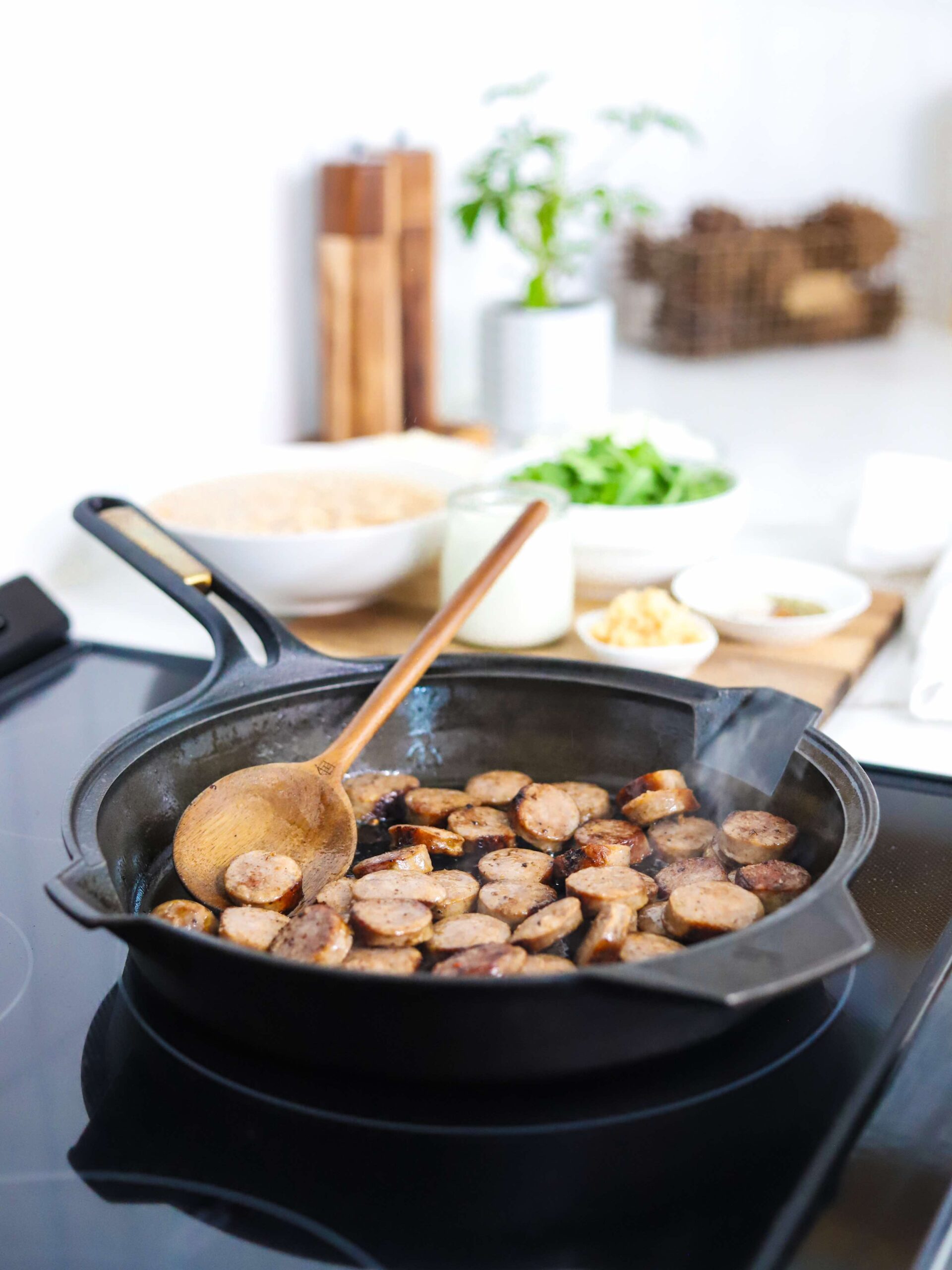 - While the skillet is warming, slice the sausages into rounds and then transfer into the skillet