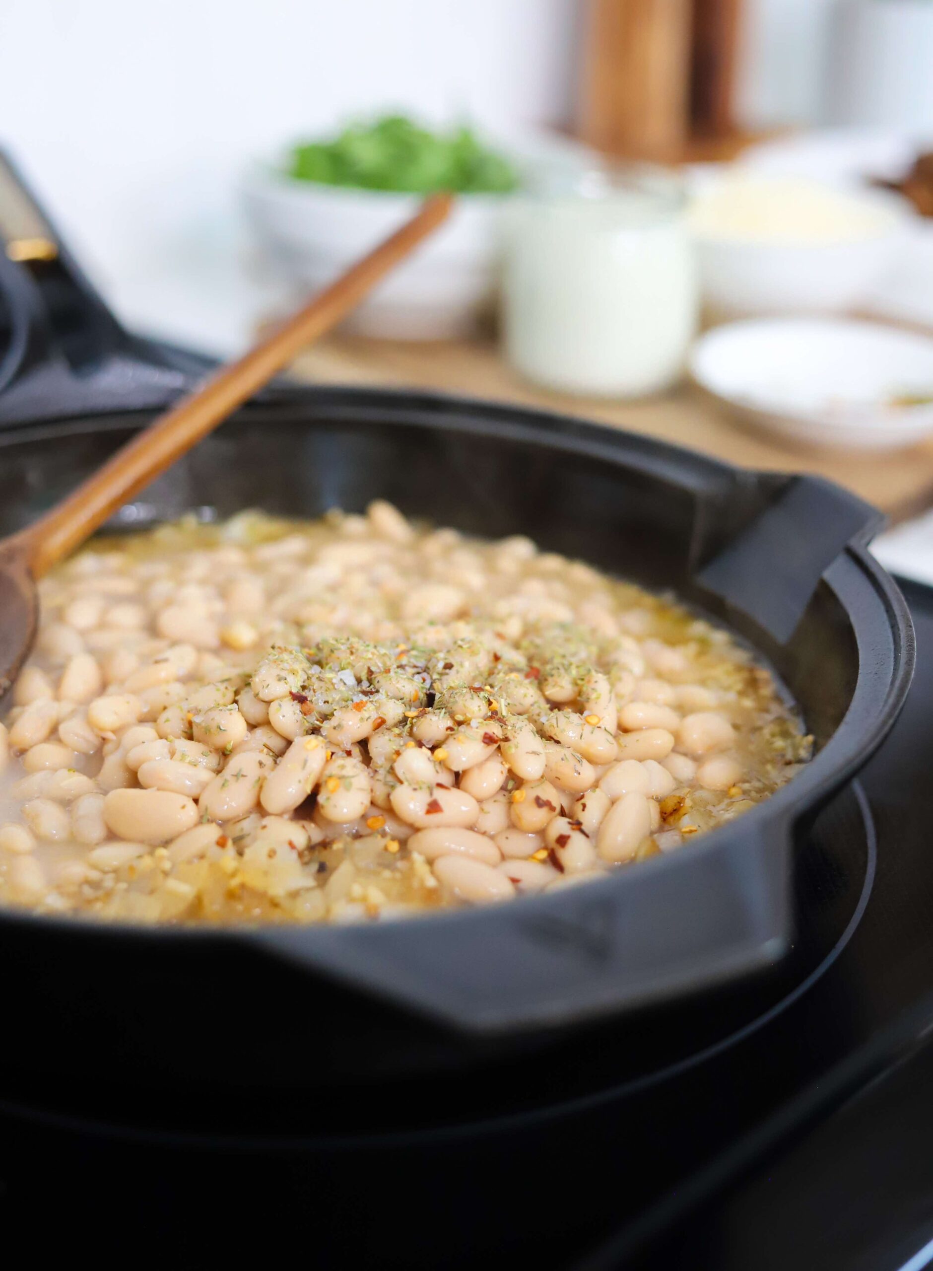 - Add 31 ounces of cannellini beans including the liquid from one can, 1/2 cup of heavy cream, 1 teaspoon of dried Italian herbs and a pinch of red pepper flakes and bring to a simmer