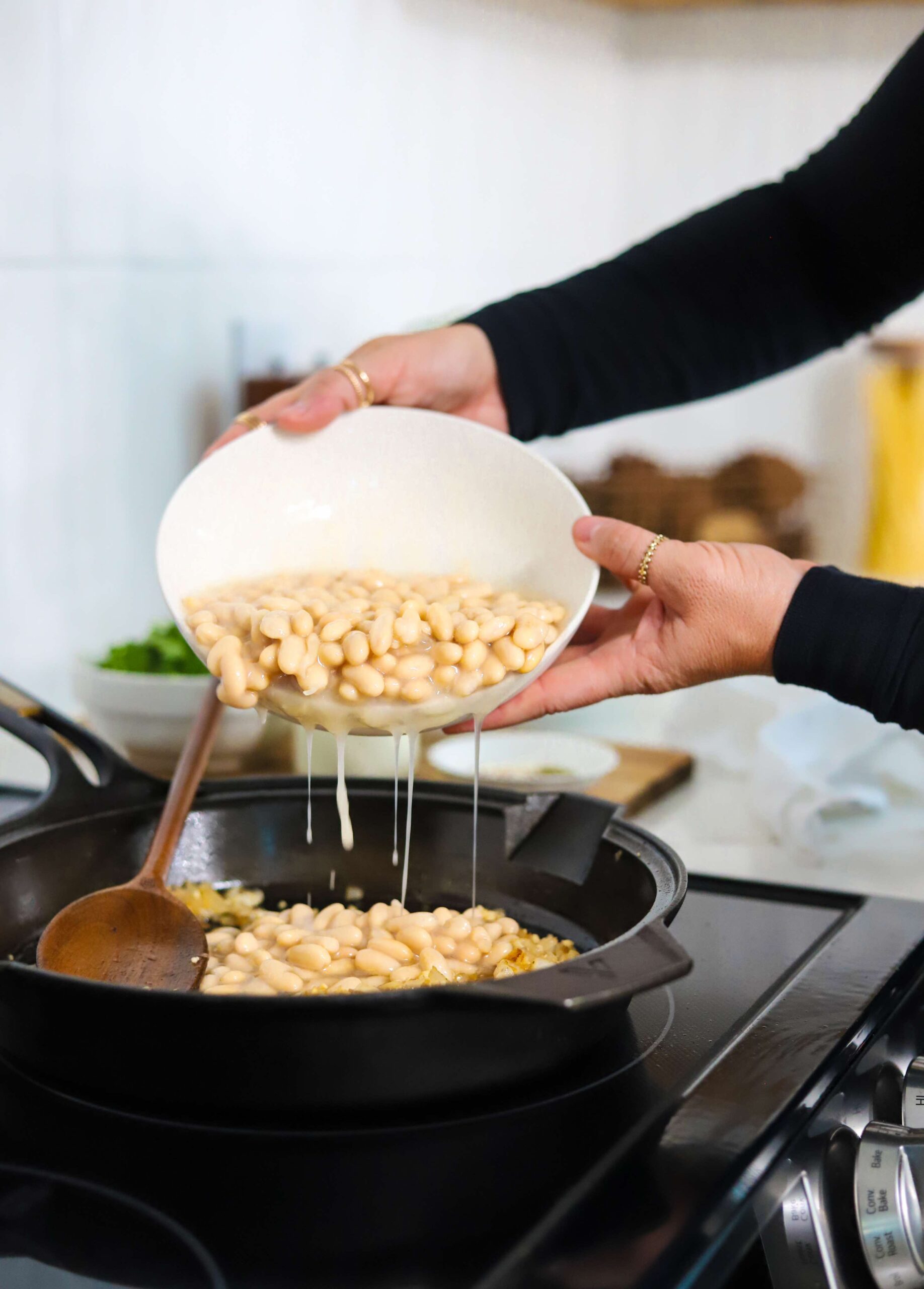 I have recently become a huge fan of cannellini beans and this skillet bring out their best flavor and texture. If you are used to draining beans before you use them, you may be surprised by what this liquid can do to create a creamy, delicious sauce. Even though we are only adding a half cup of heavy cream, this skillet is full of creamy goodness due to the addition of the cannellini bean liquid.