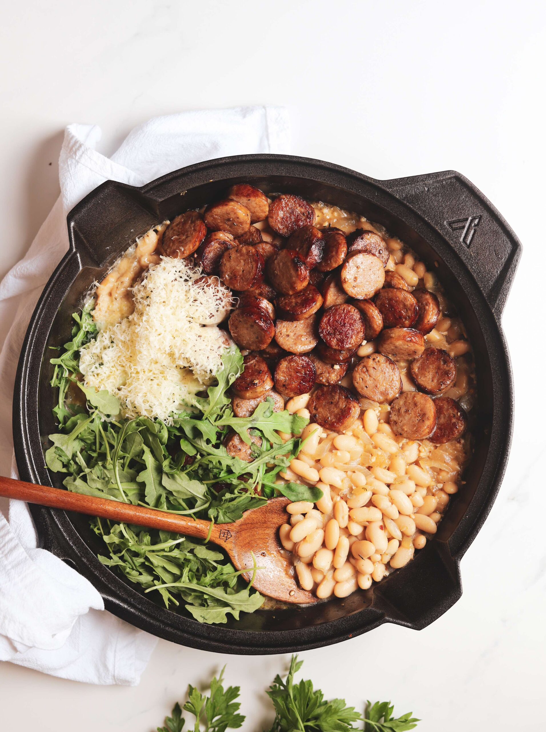 Caramelized italian sausage simmered in creamy cannellini beans with some wilted arugula and parmesan cheese may sound simple, but the flavors and textures in this skillet are complex and completely addictive. Just a little heads up, once you make this dinner, you are going to start craving it regularly, but thats fine because it is so easy to bring together.