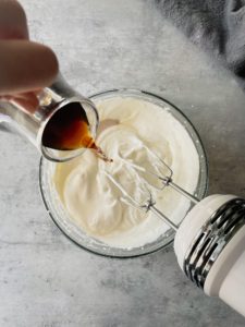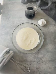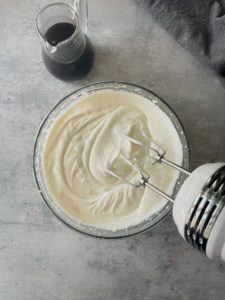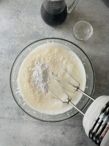 Once the coffee is fully chilled, begin whipping 1 3/4 cups of heavy cream. You can do this in a stand mixer or with an electric hand mixer. Once the heavy cream starts forming large bubbles, add 1 tablespoon of confectioners sugar and continue whipping.