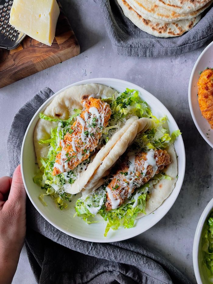 Soft, pillowy flatbread folded and filled with crispy chicken tenders and shredded lettuce that is then topped with lots of parmesan and a creamy caesar dressing. It is amazing and I know you are going to love it.