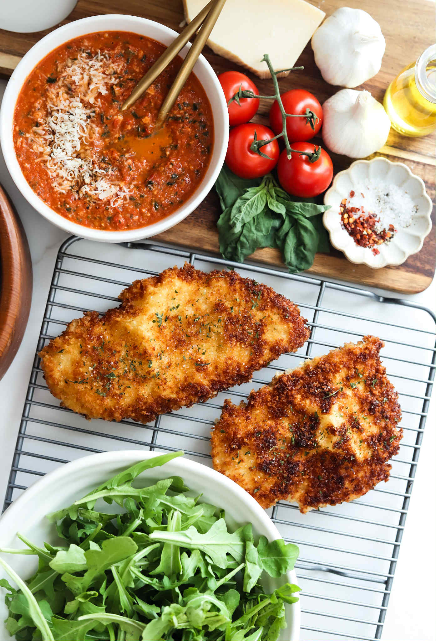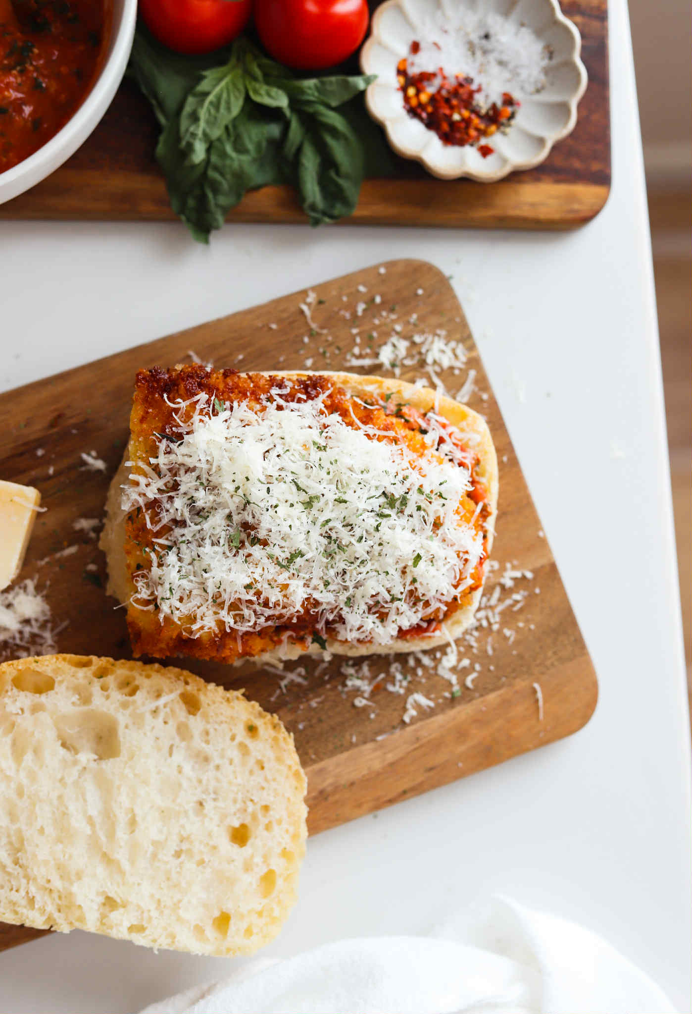 - Add a crispy chicken cutlet and top generously with shredded parmesan