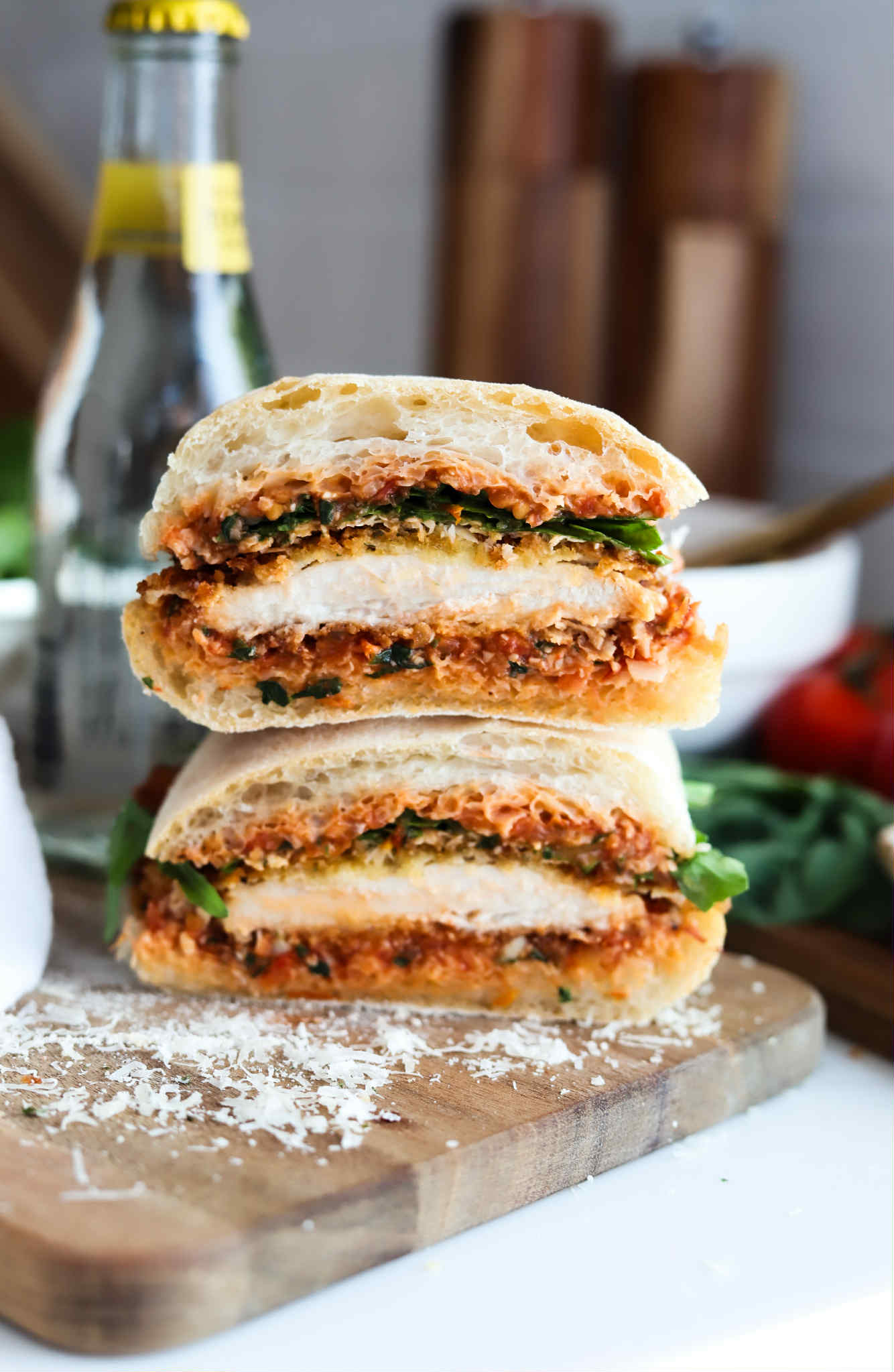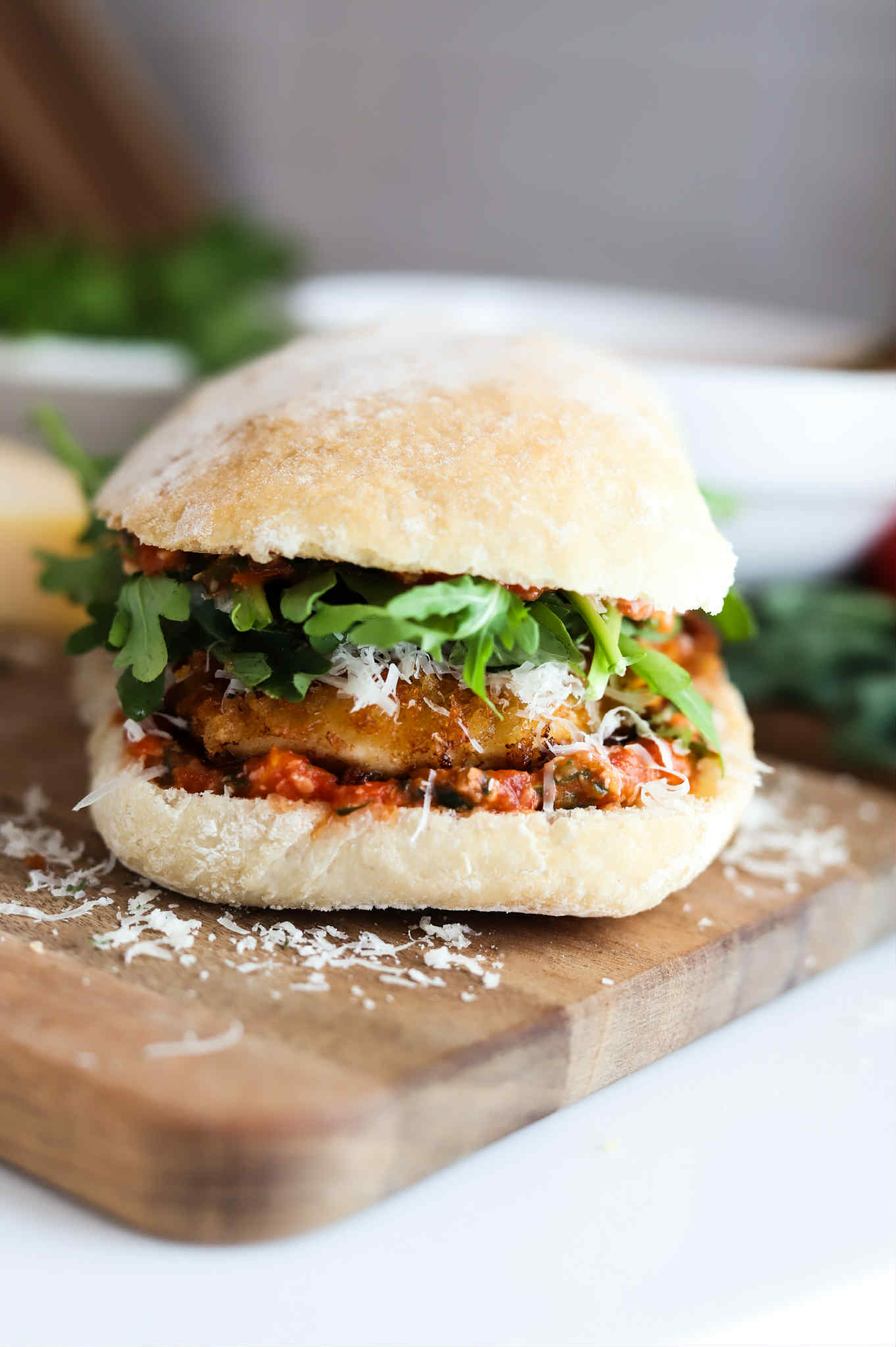 This sandwich is just a classic. It reminds me of chicken parmesan a little bit, but a little lighter with additional layers of flavor and the greens add something special too.