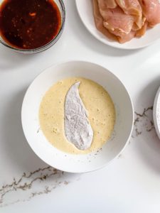 In a second shallow bowl, whisk 2 large eggs, 2 tablespoons of milk and a pinch of salt and black pepper. Keep the bowls close together and grab a silicone cutting board or sheet of parchment paper to place your coated chicken onto as you work.