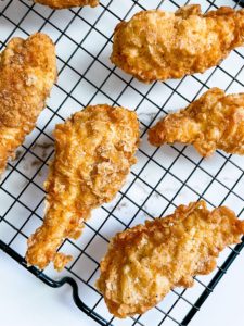 Once the tenders are deeply golden brown, crispy and cooked through (no pink inside with an internal temperature of 165 degrees), transfer them onto a cooling rack or paper towel lined plate and sprinkle with salt.
