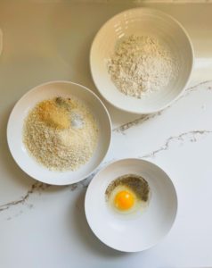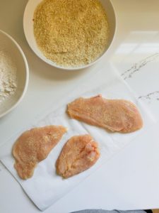 Once the chicken is thinly sliced, place it between two sheets of parchment paper or plastic wrap and pound the chicken evenly thin with a meat tenderizer or rolling pin. Season the chicken generously with salt and pepper (I also add garlic powder!) and then start the coating process…