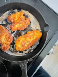 Note: Keep an eye on the temperature of your oil. If you are using a thermometer, the oil shouldn’t get much higher than 350 degrees. If you are eye balling it, lower the temperature a bit if the chicken is getting too dark before it is cooked through or if the bits that fall to the bottom of the pan begin to burn. The chicken should be cooked through after about 4-5 minutes per side.