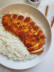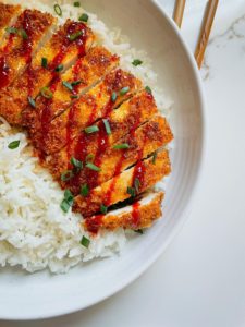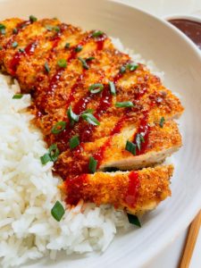 Traditionally, katsu chicken is drizzled with katsu sauce, which is a delicious asian inspired sauce made with soy, ketsup, worcestershire, garlic and ginger, but it pairs well with so many sauces! I love it with Japanese BBQ sauce, bibimbap sauce and teriyaki sauce.