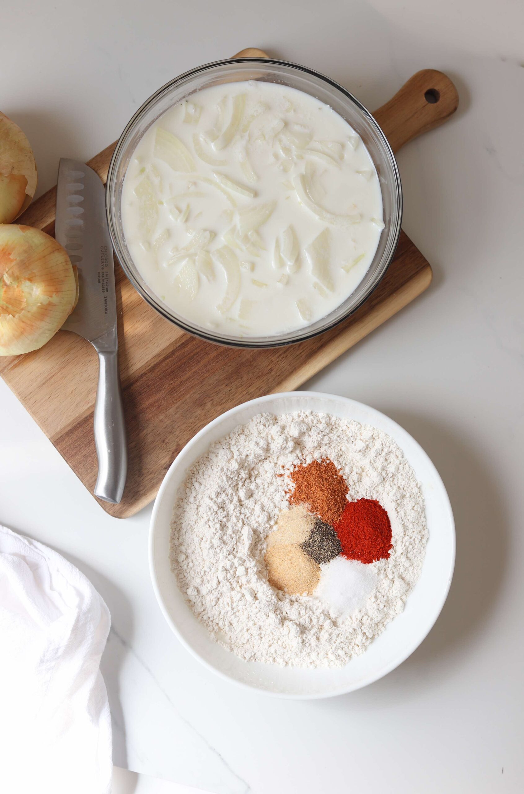 Very thinly slice two large yellow onions. Break up the slices and place them into a large bowl with about 2 cups of buttermilk. I usually put my onions in first and then add enough buttermilk to cover most of them. They are only soaking in the buttermilk, so being accurate with this measurement is unnecessary. The most important thing is that the onions are covered. Let them soak on your countertop for an hour.