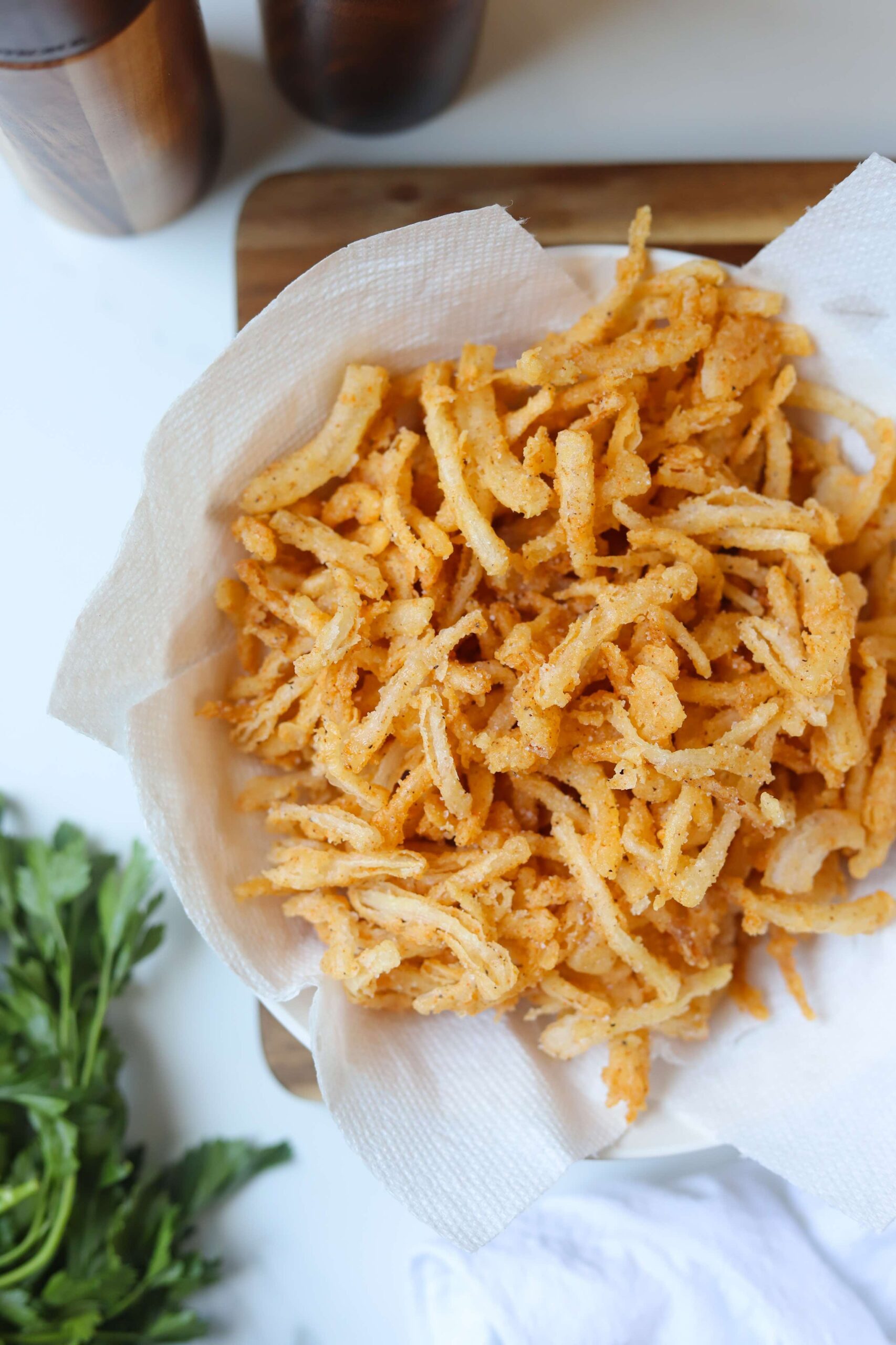 You can serve them with ANYTHING! I love them on burgers, chicken sandwiches, use them as a side dish, pile them over a salad, serve them with french onion dip or over a bowl of soup… the list goes on and on. They are so crispy and super flavorful.