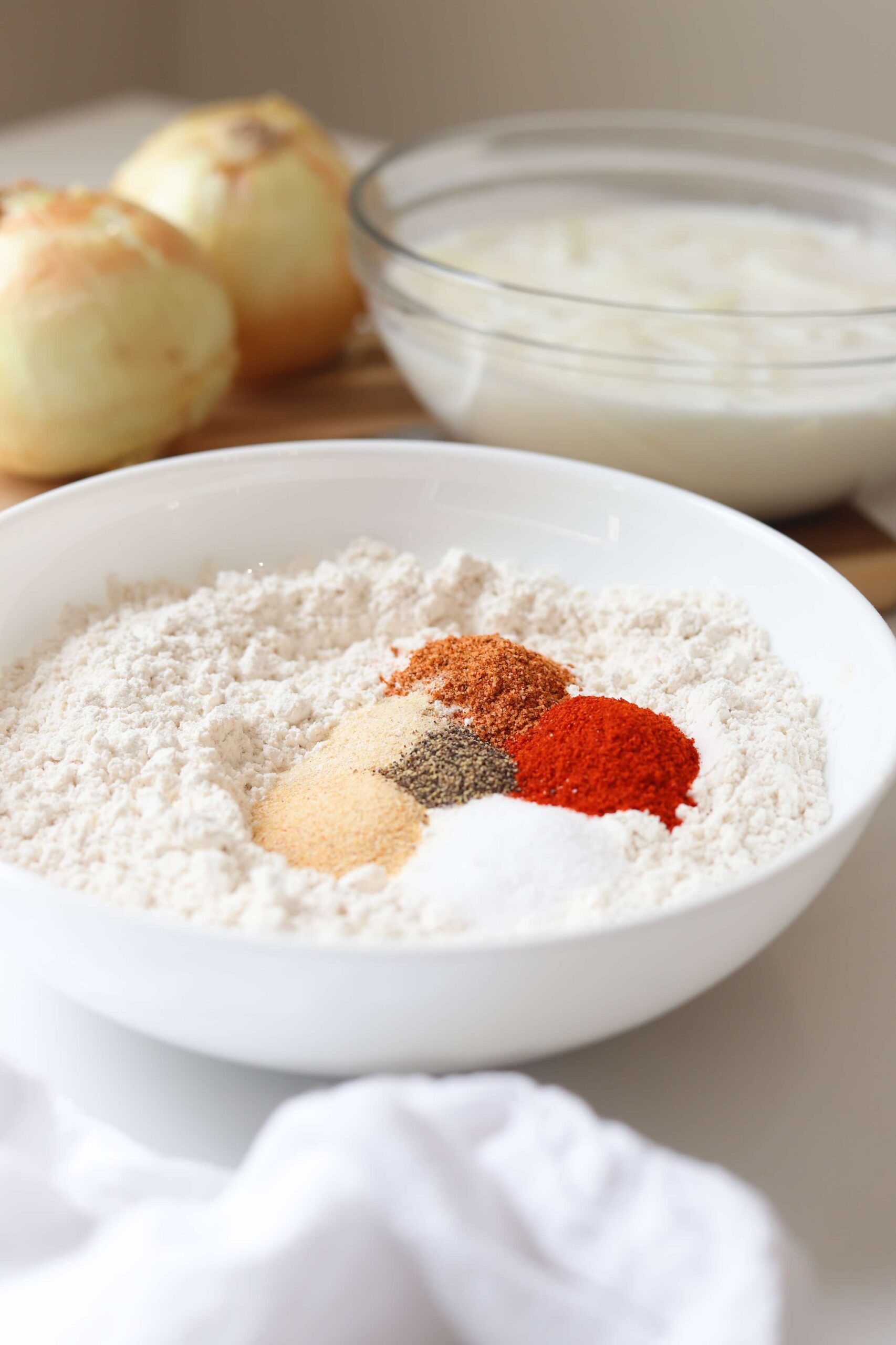 While the onions are soaking, combine 2 1/2 cups of all purpose flour with 2 teaspoons of smoked paprika, 2 teaspoons of salt, 1 teaspoon of cajun or creole seasoning, 1 teaspoon of garlic powder, 1 teaspoon of onion powder and 1/2 teaspoon of black pepper in a large bowl and set aside.